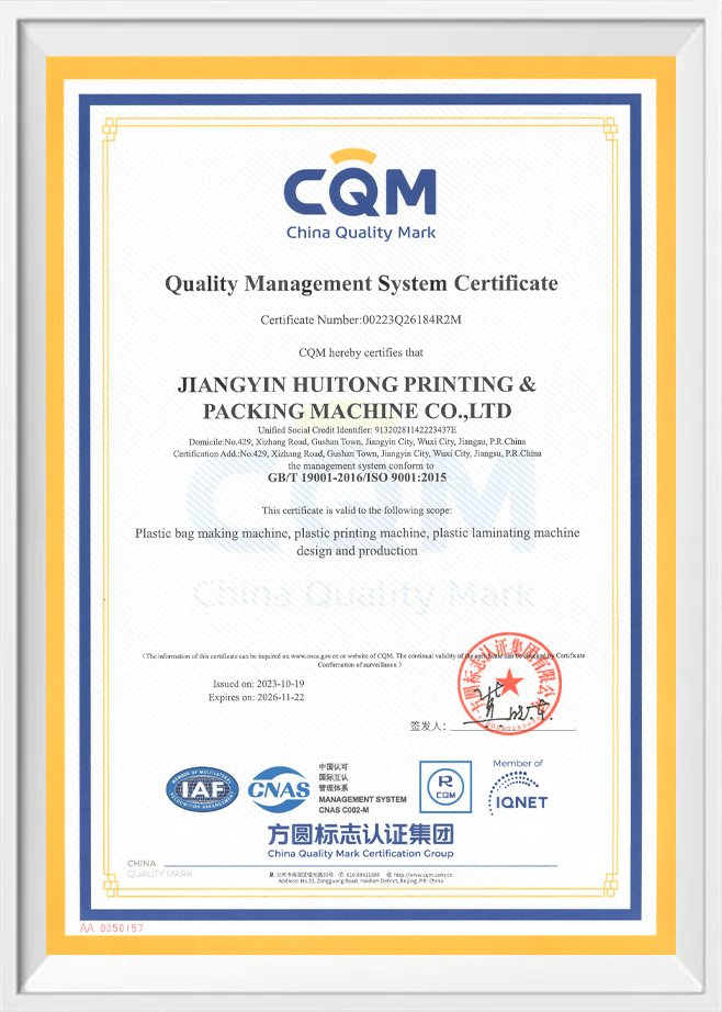 Jiangyin Huitong Packaging Machinery Co., Ltd. was established in 1996. It is located in the core area of the Yangtze River Delta Gushan Town, Jiangyin City, and covers an area of more than 100 acres. Professional produce a series of international advanced flexible packaging machinery. Now, Huitong has more than 500 employees. Among them, more than 50 are research and development inventors. The Mission of “facing to the world by innovation” leads Huitong to vigorously focus on research and development of new products. Huitong now has more than 400 patents, including 43 invention patents. Was rated “ High-tech Enterprise in Jiangsu Province”.